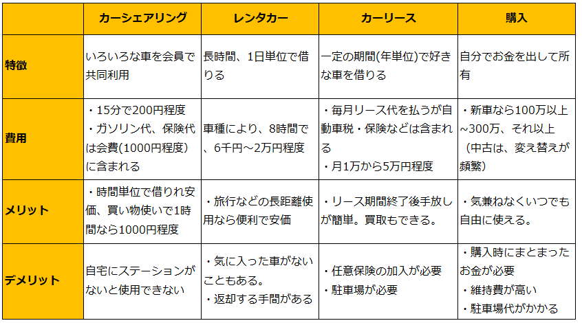 また、レンタカー、カーリースを利用する選択も考えられます。