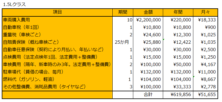 車両購入後にかかる一般的な維持費の概算を、1.5Lクラスのクルマをモデルケースに出してみました。