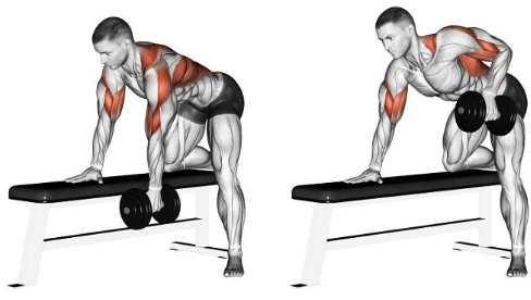 - フラットベンチに体の片側の膝と手を乗せ、半身だけ四つん這いの体勢をとる